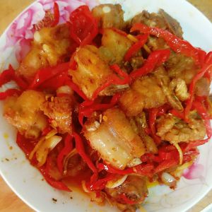 煎好之后,放入适量辣椒粉,翻炒片刻到辣椒粉爆香。加入一碗水到排骨位置。