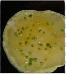待面糊凝固后,倒入适量鸡蛋液,转动锅部,使蛋液平铺在饼面上,均匀撒入葱花;