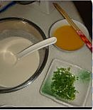 面粉加温水和盐搅成稀面糊,最好饧半个小时;(或者把盐搅在鸡蛋液里)