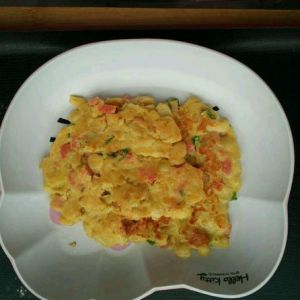 将玉米粒、面粉、鸡蛋、葱花、盐、耗油放入捣碎的土豆泥中(我多加了一点火腿肠(*^ω^*))