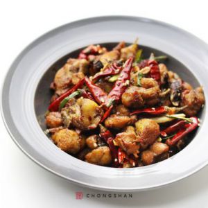 锅内放底油,大火烧热,放入大蒜、葱、生姜、泡椒、麻辣酱一起爆香,再放入炸好的鸡肉翻炒,直至鸡肉均匀地沾上酱汁。