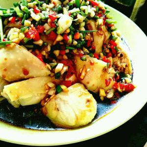 最后浇汁。葱姜蒜末,六月鮮,糖,醋,香油拌匀,撒上花生碎