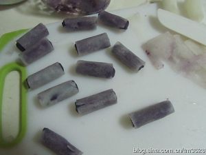 将白萝卜皮切成小段,在中间包上准备好的紫薯馅;
