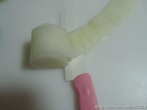 将泡过的萝卜控下水, 用小刀刨层薄薄的皮,皮要尽量薄一些, 这样更透明;