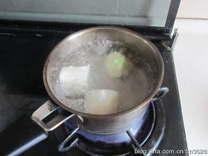 烧锅水, 加入少量的盐, 将切好段的白萝卜放在水中焯一下;