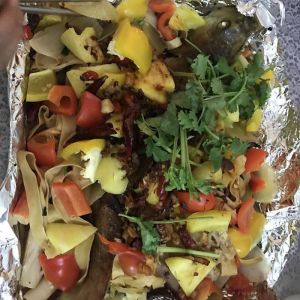 烤鱼的时间用来准备配菜,喜欢什么放什么,将配菜焯水,然后用辣椒、葱、豆瓣酱将焯水的配菜翻炒,不要炒烂。烤鱼烤好以后将炒好的配菜放入烤盘,再次进入烤箱烤5分钟。这个期间再热油 炒辣椒 花椒 麻椒 豆瓣酱 将这些炒热,烤鱼烤好以后淋在上面。就完成了!