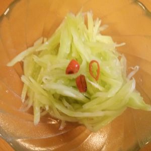 我照大棵的来把这样小勺一勺半差不多。放入切好的莴笋丝里面拌一下。等莴笋里面的水出来的差不多了,将水倒干。
