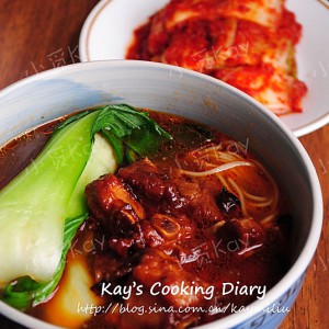 排骨炖烂后大火收汁,即为红烧排骨面的盖码。