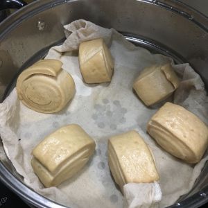 发酵后的面要充分揉搓,将里面的空气排干净,我揉了差不多半个小时,擀成长方形,再卷成条状,切成等分大小方块,上蒸锅静至30分钟再次醒面,再蒸20分钟左右