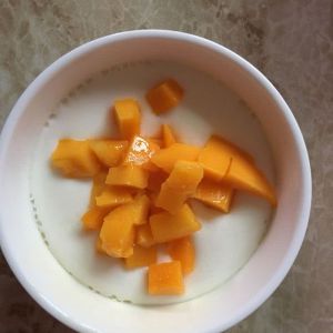 十分钟后拿起来,把切好的芒果放在上面即可!