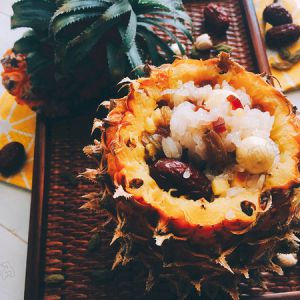 糯米和莲子提前一晚泡水,菠萝在第二天切开一个小盖子;