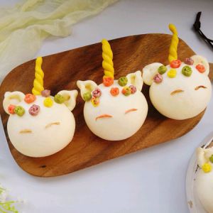 再分割出5个3克的小面团做独角兽的耳朵,和1个15克的小面团做成独角兽的角,剩下的面团用来做额头上的小花朵。