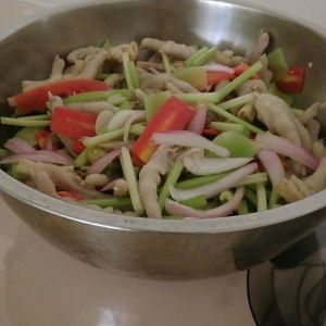 把洋葱,芹菜切成段,胡萝卜,莴笋切成片。(配菜可根据个人喜欢搭配,但我个人喜欢加点胡萝卜,这样颜色比较好看,也可以换成甜椒。)