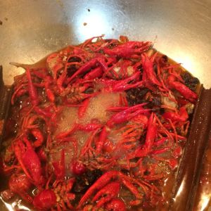 配料炒出香味后放进炸好的龙虾放盐鸡精和生抽继续翻炒几分钟让香料与龙虾混合,放水没过龙虾盖上锅盖大火煮十五分钟!