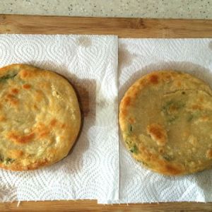 边做时忘记拍照…面团擀成椭圆形,在表面抹油、盐,撒葱花和芝麻,再从长的一边开始卷成条状,卷好后在像图示扭成一团。静置15min后,用手按扁再擀平成圆饼状。