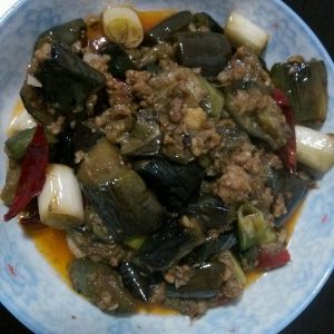 猪肉切成小粒,码盐淀粉。留少许油,放入大蒜,泡椒,郫县豆瓣,姜,花椒,猪肉粒炒香。然后下茄子,导入酱油,大葱,盐翻炒,最后加入味精起锅。