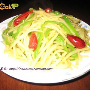 炒锅中放油,加入几粒干红椒,油稍热迅速放入土豆丝偏炒几下,加入青椒丝.盐.出锅前锅边淋入香醋.少许鸡精翻炒几下出锅。