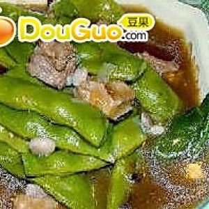 放入一勺糖,一勺老抽(上色)下排骨炒,一直到排骨两端的骨头露一些出来,放烧开的热火,没过排骨多一点,放豆角。