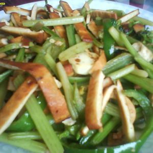起锅放油爆香蒜,放入芹菜,翻炒片刻再放入香干和小许盐翻炒