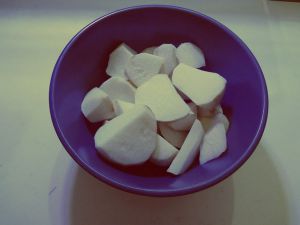 把芋头切块。先下锅煮芋头,大约十分钟,待芋头软后,放白菜。