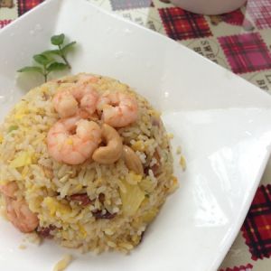 蛋炒饭和青豆萝卜丁翻炒,下入虾仁和菠萝丁,最后下入腰果