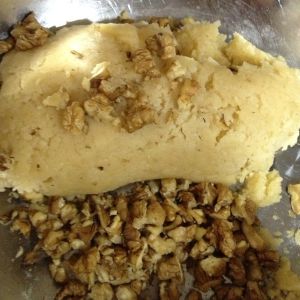 混合均匀后,加入捏碎的核桃仁,不要弄得太碎,自己做的核桃酥核桃一定要多加点啊