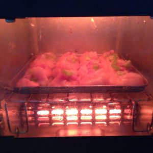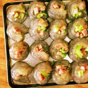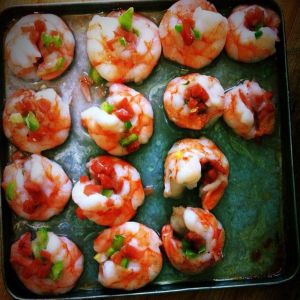 将腌好的虾,内侧用刀划开便于塞入火腿丁及青椒丁,将烤盘刷好油,摆放好准备进烤箱