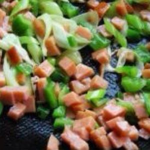 将熏肉火腿切丁,青椒切丁,加入少许淀粉及水,搅拌,可适当添加鸡精调味