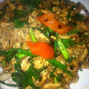 锅内注油烧八成热放葱姜蒜炒香,放鸡肉翻炒几下,然后放蒜苗、青红椒翻炒,最后放入豆豉翻炒,出锅