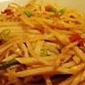 快放淀粉和水吧!拿起备用的混合品(淀粉与水的混合均匀品),倒入一半在土豆上(一定要在土豆上,倒在锅上马上就粘稠成做糖葫芦的糖啦!)翻炒几下再倒入剩下的"淀粉水".再放点黑胡椒,拧碎了均匀撒上,对了,别忘了拿根筷子,把粘在锅铲上的土豆丝扒拉下来,否则铲子上面的土豆丝什么调料也没沾上很难吃哦~~呵呵.如果喜欢有点辣味的,就放点洗净切条的青椒辣椒吧!
