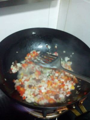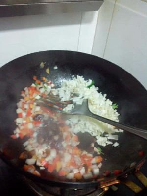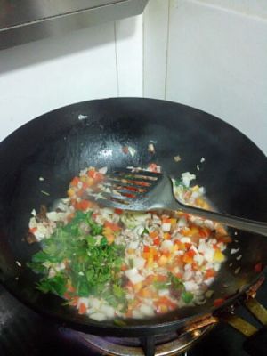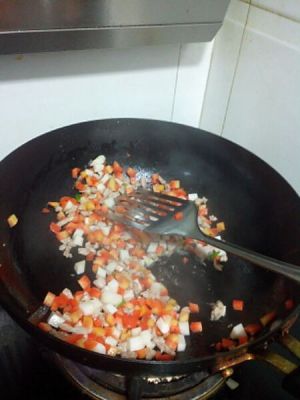 下胡萝卜和芋头丁,加盐,多炒会,至胡萝卜轻微透明