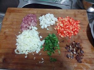 胡萝卜'芋头'白菜'香菜'猪肉'香肠切丁备用