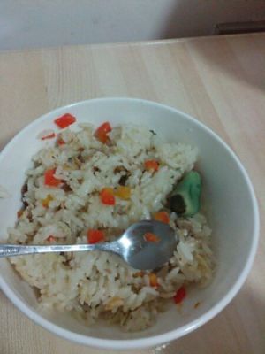 和洗净的大米拌匀放电饭煲,有菜汁了,比平时少放些水煮饭