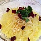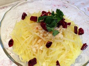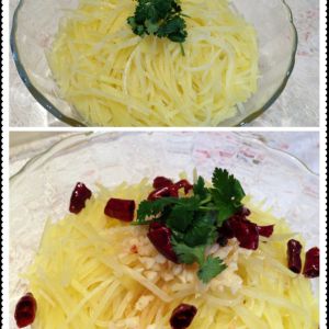 再下入干辣椒段炸香后倒入土豆丝中。再加入蒜末,盐,味精,香油,香菜拌匀即可。