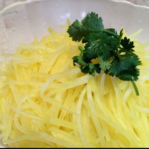 土豆土皮,切成细丝。香菜切段。辣椒切段备用。蒜切末。