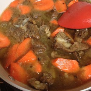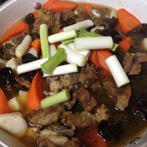 羊肉熟后,加入去皮的胡萝卜块,再炖至萝卜熟。