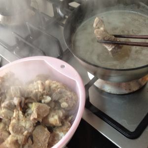 加一大勺生抽,大碗水,盐,胡椒,烧至水开,即转小火炖1个半小时,此过程用高压锅也可。