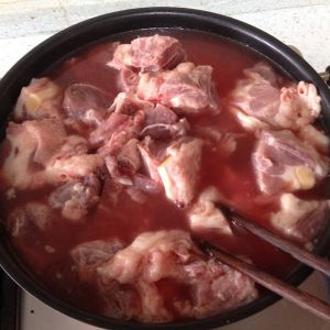此时煮至羊肉无血水,从锅中拈出羊肉块,沥水。