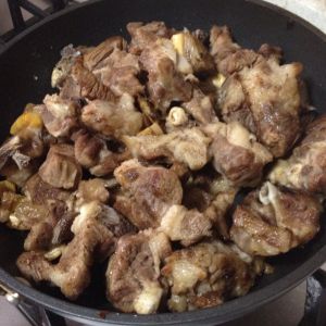 羊肉倒入不沾锅内,开中火,加姜片,柠檬皮(桔子皮,橙子皮也可),香叶,尖椒,花椒,倒点料酒,一起煸炒至焦香出油即可。