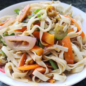 配菜炒好后加入煮好的面条翻炒均匀即可出锅