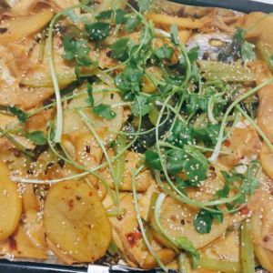 烤箱烤20分钟左右就可以将需要炒熟的配菜炒上了,锅里放上油,热了放郫县豆瓣,花椒,辣椒段,然后将配菜放入锅中,出锅之前加入盐,盐量是配菜需要的就可以。如果有喜欢有汤汁的烤鱼,就在这步加点汤汁,后面和配菜一起放入烤盘。