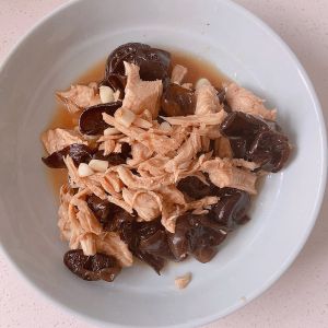 蒜末 生抽 醋 香油 盐 糖 鸡精 调汁 加入木耳 肉丝 搅拌均匀