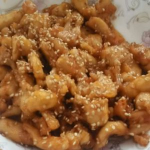 锅中放入调好的汁,加热冒泡,放入炸好的鸡胸肉翻炒