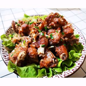 将多余的油倒出,放入洋葱丁,翻炒至无水分,倒入炸好的排骨和洋葱丁翻炒,煸出香味,再放入椒盐,小葱,翻炒均匀,就可以出锅啦!