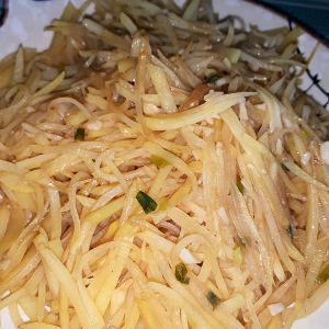 锅内放油,放蒜末葱花炒香,放土豆丝煸炒,沿着锅边放一点醋,继续煸炒至土豆丝变软,放少许生抽和盐,咸淡适度,如果土豆丝有些糊锅可以放少许清水