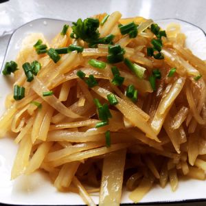 热锅下油,放土豆丝,中火翻炒30秒左右,再加蒜,继续翻炒几下,大概10秒左右,然后加入料酒,酱油,蚝油,米醋,盐,鸡精,把土豆丝炒熟就可以了。最后装盘撒点葱花。