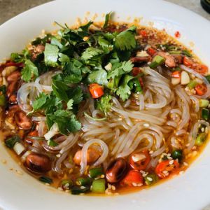 煮好的粉丝放入碗中,再放上花生米和香菜,就可以开吃啦!