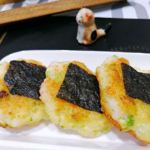 手上拍水,团成小饼,贴上剪好的小海苔片。