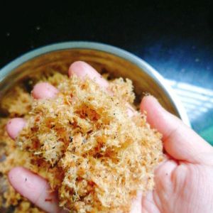 倒回炒锅,加入自制海苔芝麻粉(没有可以改成芝麻或者不放) ,四勺食用油,小火翻炒至又酥又干