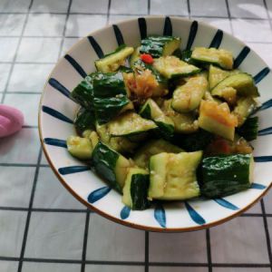 锅里烧油,先把蒜爆香,爱吃辣的一起把辣椒放进去,我家有宝宝我是和黄瓜一起放的辣椒,等大蒜爆香以后就可以关火了